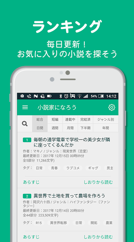 「小説家になろう」グループに投稿された小説をスマホで見やすく、快適に表示できるアプリです。小説家になろう、小説を読もう専用リーダーアプリとなっております。