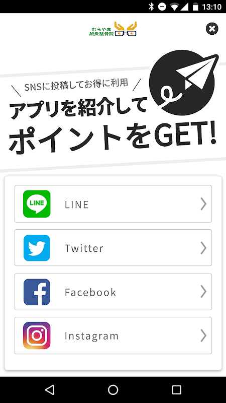 むらやま整骨のアプリをSNSを通じてお友達に紹介する事ができます。