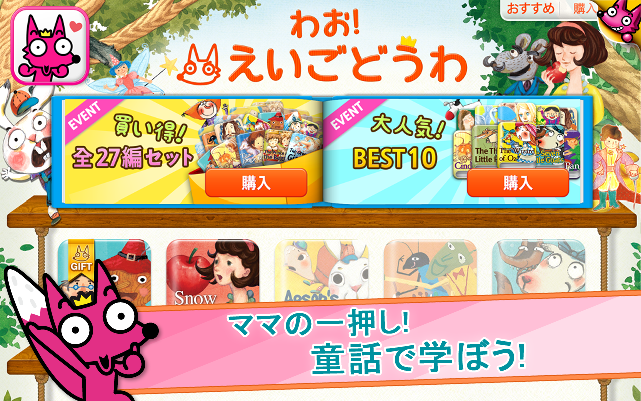 [わお!えいごどうわ]は、簡単・楽しく英語に親しめるように子供たちにに人気があるお話で構成してあります。