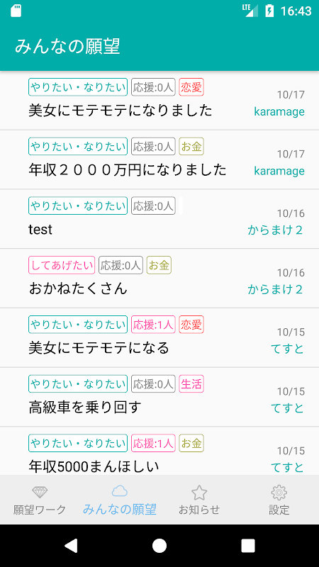 「みんなの願望」では、他の人の公開された願望を見たり、応援したりすることができます。