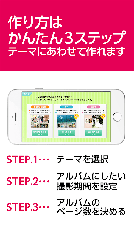 フォトブックに入れたい写真の「撮影期間」と作成したい「ページ数」を選ぶだけ!