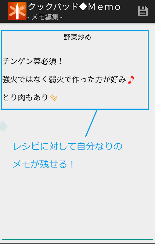 【 Cookpad ◆ Memo 】เป็นเบราว์เซอร์พิเศษ (ไม่เป็นทางการ) ของ "Cookpad" ในไซต์การทำอาหาร คุณสามารถลงทะเบียนสูตรที่คุณโปรดปรานคุณสามารถจัดหมวดหมู่และทิ้งโน้ตไว้ได้