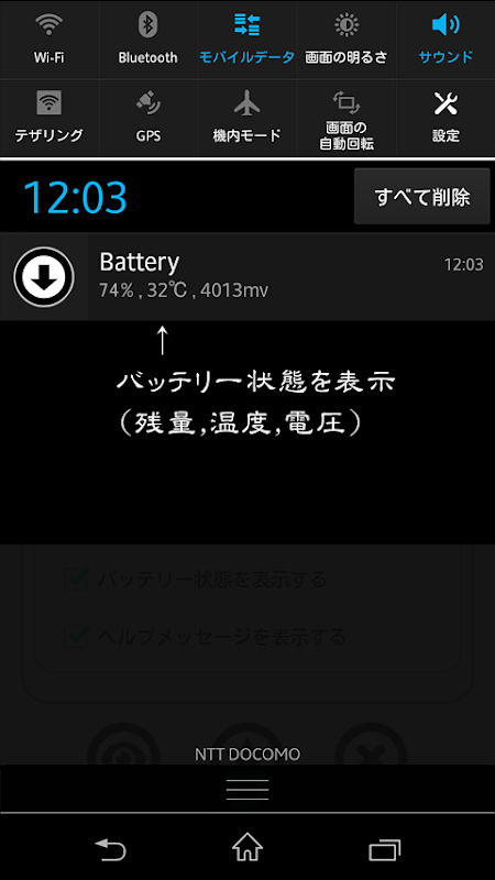 ステータスバーを開いた時に、バッテリー残量、温度、電圧が表示されます。