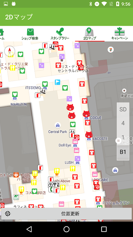 名古屋セントラルパーク内ではBluetoothをONにすることによって地下街でも地図上に自分の位置が表示されます。