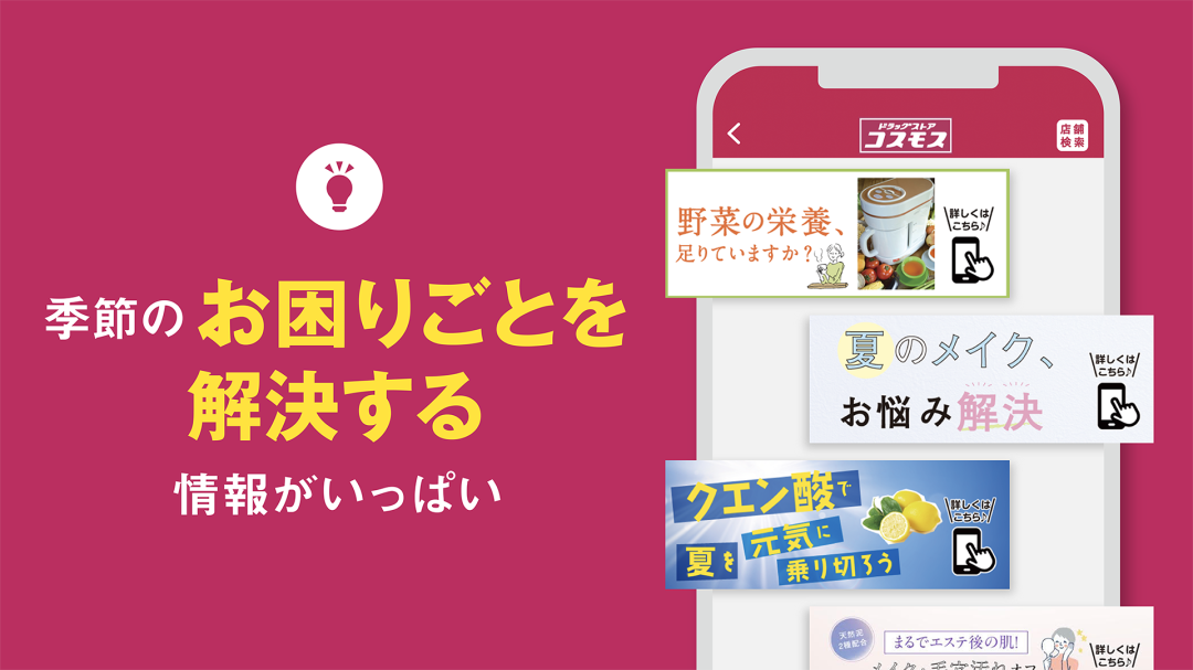 แอปอย่างเป็นทางการของ "Drugstore Cosmos" ข้อมูลผลิตภัณฑ์ใหม่ ข้อมูลแผ่นพับ และร้านค้าออนไลน์มีอยู่ในแอปเดียวนี้ด้วย คูปองที่ยอดเยี่ยมและการค้นหาร้านค้าที่ง่ายดาย