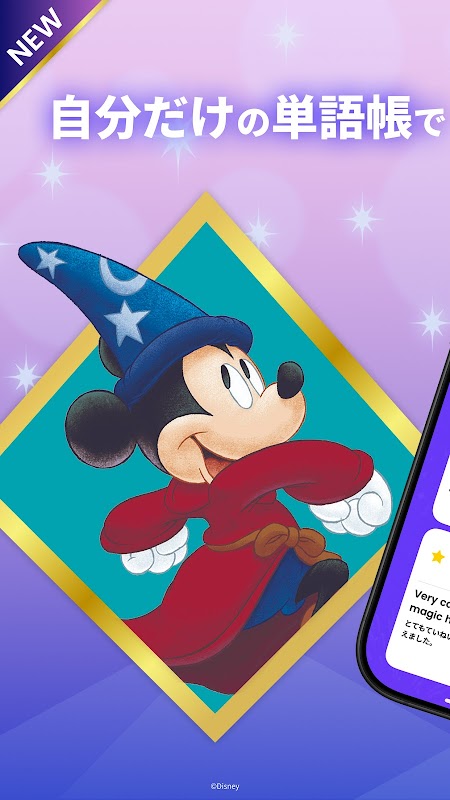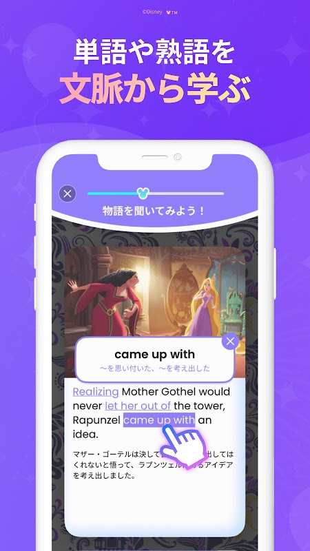 เสริมทักษะภาษาอังกฤษทั้งสี่ทักษะของคุณผ่านการฟังและการฝึกพูดตามจังหวะขณะฟังภาพยนตร์ดิสนีย์และพิกซาร์ชื่อดัง เช่น "โฉมงามกับเจ้าชายอสูร" และ "ราพันเซล" ภาพยนตร์แต่ละเรื่องแบ่งตามระดับความยาก คุณจึงสามารถเรียนรู้ด้วยภาพยนตร์ที่เหมาะสมกับระดับภาษาอังกฤษของคุณได้ นอกจากนี้ยังมีเรื่องสั้นมากมาย (ฉบับสั้น) ซึ่งแต่ละเรื่องจะเน้นเฉพาะประเด็นหลักของเรื่อง แม้ในช่วงเวลาสั้นๆ คุณก็สามารถสัมผัสได้ถึงความสำเร็จในการเรียนรู้ภาษาอังกฤษของคุณ