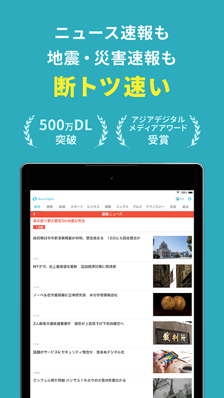 "NewsDigest" ซึ่งครอบคลุมข่าวด่วน ข่าวแผ่นดินไหว และข่าวภัยพิบัติ เป็นแอปข่าวแอปแรกในญี่ปุ่นที่ชนะรางวัล Asian Digital Media Award อันทรงเกียรติ ดังนั้นคุณจะรู้สึกปลอดภัยหากติดตั้งไว้