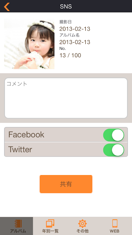 ・フォトの共有機能(Facebook、Twitter)