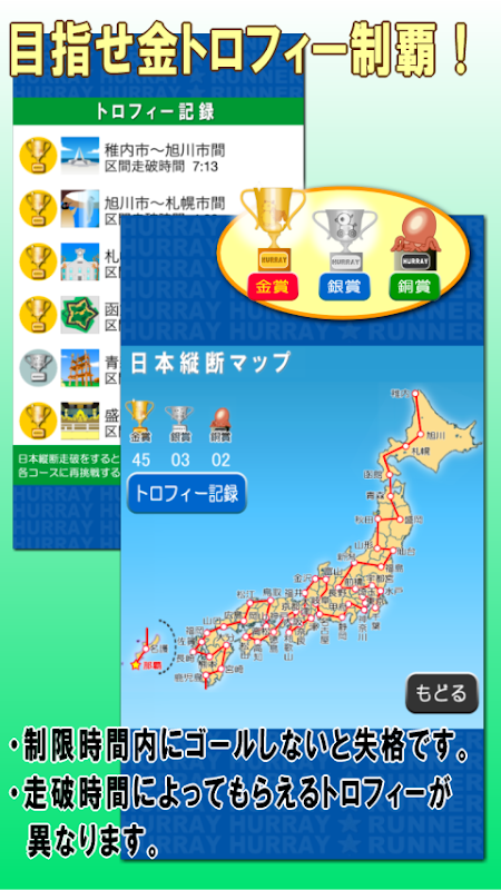 遊びかたはカンタン! スマホの中でリアルタイムで走り続けるランナーを応援でサポートしながら各コースを制限時間内にゴールさせ、そして日本縦断走破を達成させる放置系ゲームです。