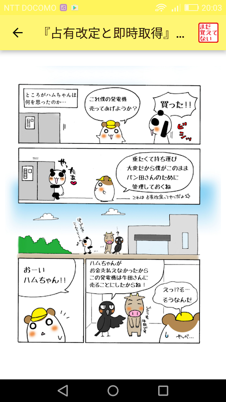 このアプリはよくある「マンガでわかる○○」とあるのに、実際にはマンガはオマケ程度でほとんど文章解説ばかりという本とは違い、民法判例の事実関係から、結論まで全てマンガにして分かりやすく解説します。マンガの他に簡単な文章解説も用意しているので、更に理解が深まります。
