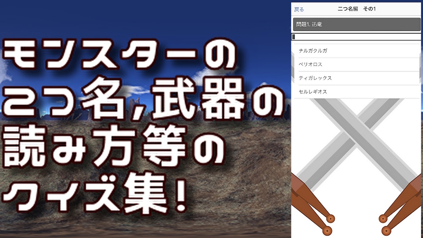 ครั้งนี้ ฉันทำแอพตอบคำถามสำหรับซีรีย์ Monster Hunter ฟรี สำหรับตอนนี้ เราได้บันทึกชื่อสัตว์ประหลาดสองชื่อและแบบทดสอบเกี่ยวกับวิธีการอ่านอาวุธ แต่เราวางแผนที่จะอัปเดตคำถามเป็นครั้งคราว ขอขอบคุณ