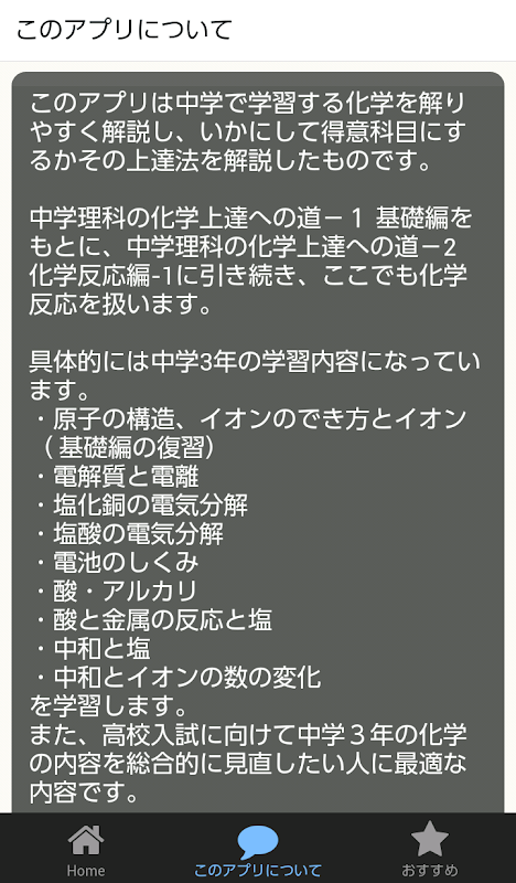 このアプリは中学の教科書で学習する化学を解りやすく解説し、いかにして得意科目にするかそのマスターへの道を解説した参考書のようなものです。