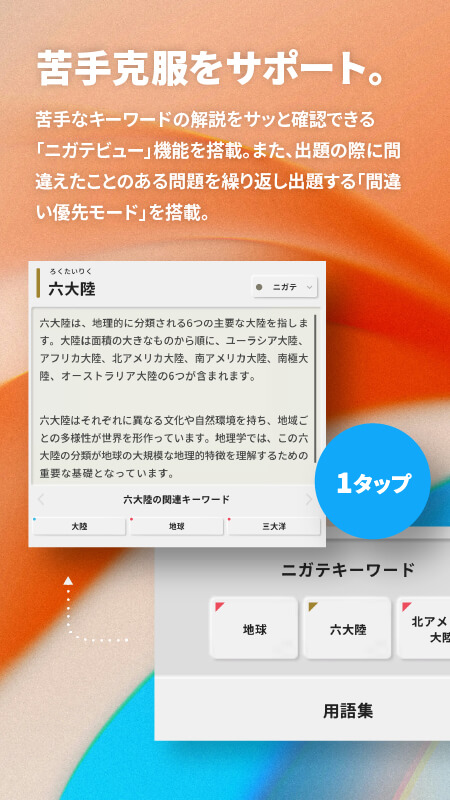 คุณสามารถตรวจสอบคำถามและคำอธิบายที่คุณอ่อนได้เสมอจาก "มุมมองจุดอ่อน" ก่อนและหลังขั้นตอน ซึ่งตรวจสอบได้ง่าย นอกจากนี้ยังมีฟังก์ชันที่จัดลำดับความสำคัญของคำถามที่คุณทำผิด (คุณสามารถเปิด/ปิดได้ในหน้าจอการตั้งค่า) ศึกษาไปพร้อมกับการทบทวนจุดอ่อนของคุณซ้ำๆ และค่อยๆ พัฒนาไปทีละขั้นตอน
