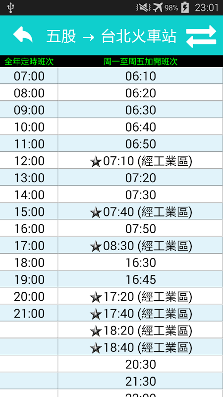 1.提供「五股」往返「台北火車站」免費接駁巴士時刻表。