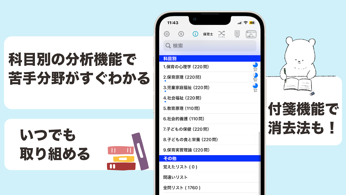 เป็นฟังก์ชันที่มีประโยชน์สำหรับการสอบครูอนุบาล และมีฟังก์ชันการวิเคราะห์ที่มีประสิทธิภาพในการเตรียมสอบ อย่าลืมหาจุดอ่อนของคุณและใช้มันเพื่ออ่านหนังสือสอบ