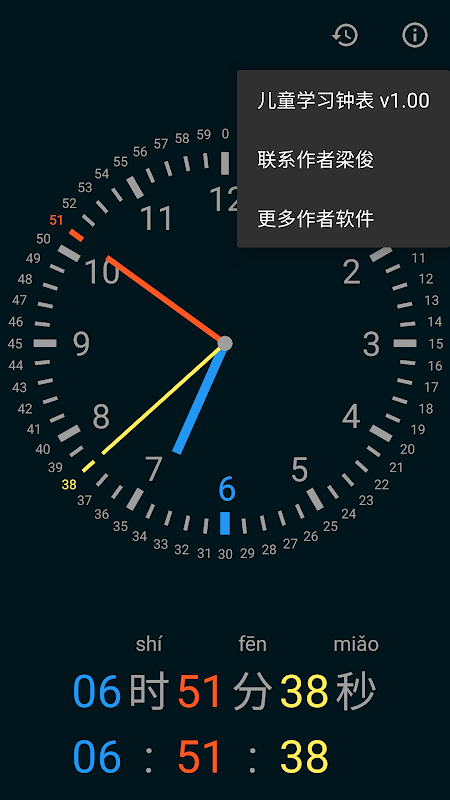 可以清晰的看到时针(蓝色),分针(红色),秒针(黄色)是如何转动并计时的。