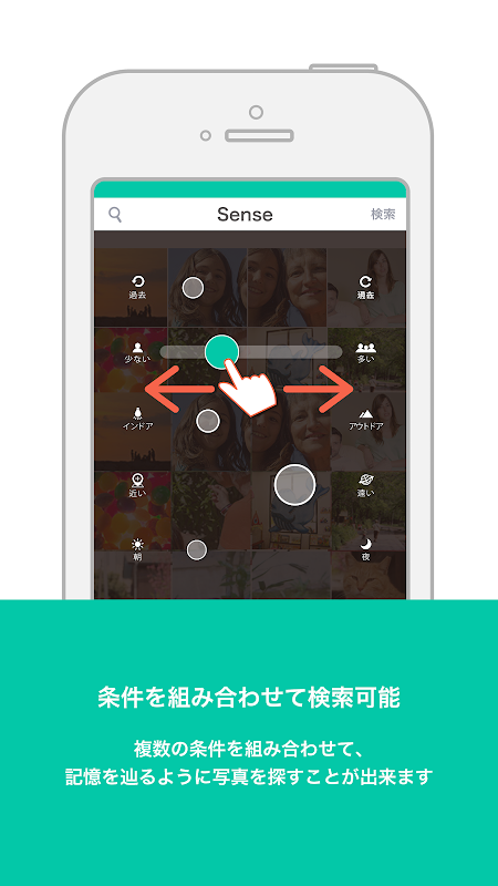 写真を撮影した際のおおよその時期や時間帯、写っている人の人数、撮影シーン、場所(現在地からの距離)を組み合わせて、記憶を辿るような感覚で写真を検索することができます。