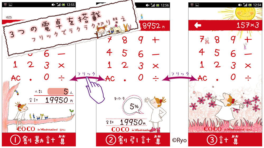 いつも元気イッパイ☆COCOちゃんが計算してくれる♪かわいい電卓アプリが登場!「割り勘計算」と「割引計算」、「履歴機能」もできちゃう女の子のマストアイテム!!