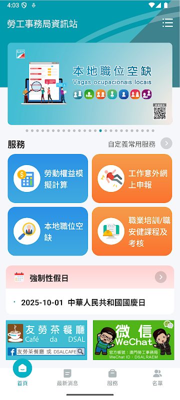 สถานีข้อมูลสำนักงานกิจการแรงงานเป็นแอปพลิเคชันบนมือถือที่พัฒนาโดยสำนักงานกิจการแรงงานของรัฐบาลเขตบริหารพิเศษมาเก๊า เพื่อให้สาธารณชนสามารถรับข้อมูลต่างๆ เกี่ยวกับแรงงาน การจ้างงาน ความปลอดภัยและอาชีวอนามัย และการฝึกอบรมอาชีวศึกษาจากสำนักงานกิจการแรงงานได้ทุกที่ทุกเวลา ด้วยแอปพลิเคชันมือถือนี้ ผู้ใช้ไม่เพียงแต่สามารถดู "ข่าวสารล่าสุด" ของสำนักงานแรงงานเท่านั้น แต่ยังสามารถดูข้อมูลต่างๆ และใช้ฟังก์ชันต่างๆ ต่อไปนี้ได้อีกด้วย ซึ่งได้แก่ วันหยุดบังคับ การคำนวณจำลองสิทธิแรงงาน การรายงานอุบัติเหตุจากการทำงาน และหลักสูตรการเรียนรู้แบบออนไลน์