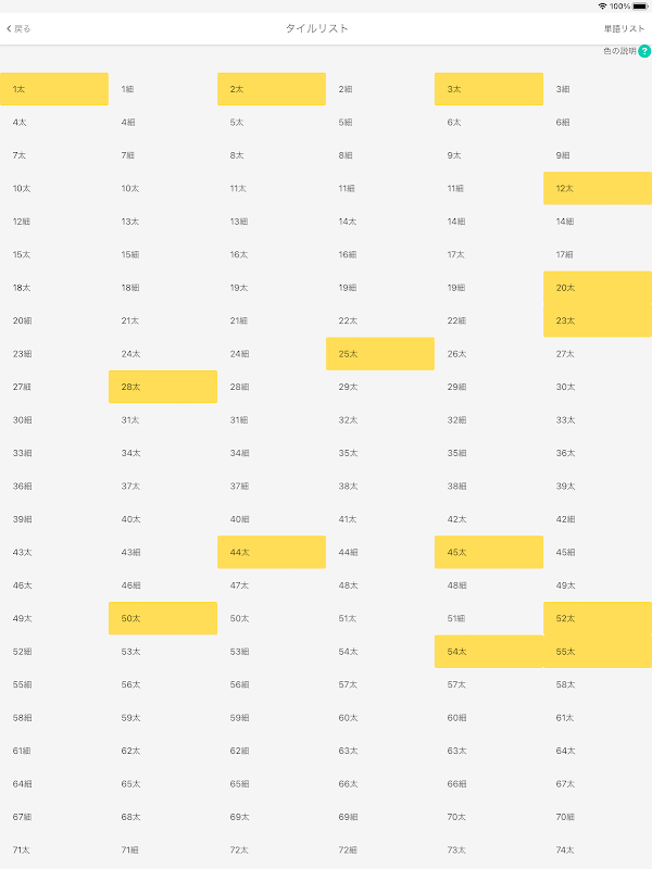 เราได้เตรียมรายการไทล์ที่ให้สีตามคำศัพท์ที่คุณได้เรียนรู้ คุณสามารถดูความคืบหน้าได้อย่างรวดเร็ว
