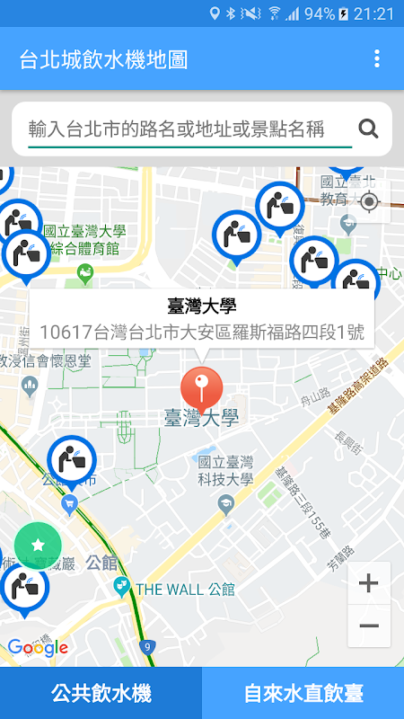 2. 可輸入台北市的路名/地址/景點名稱(例如:台北101、台大醫院、和平東路二段339號...等)來查看周邊的公共飲水機或是自來水直飲臺。