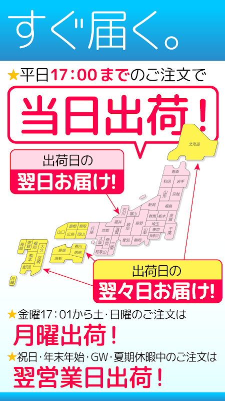 ◆หากคุณสั่งซื้อภายในเวลา 17.00 น. ของวันธรรมดา คุณสามารถวางใจได้ด้วยบริการจัดส่งที่รวดเร็วของเรา ซึ่งจัดส่งในวันถัดไปในฮอนชู (ยกเว้นภูมิภาคชูโกกุ)