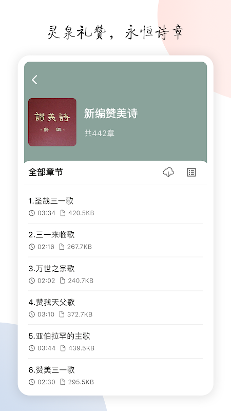 ประกอบด้วยเพลงสรรเสริญแบบคลาสสิกและเพลงนมัสการสมัยใหม่ ข้อความและเสียงจะถูกนำเสนออย่างซิงโครไนซ์ ช่วยให้คุณเข้าใกล้พระเจ้ามากขึ้นในการปฏิบัติทางจิตวิญญาณ • บันทึกประวัติและรวบรวมบุ๊กมาร์ก
