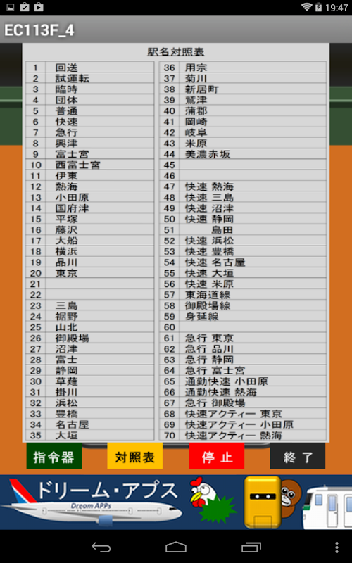駅名対照表で列車種別と行先を確認して、それに対応する番号を指令器に入力します。