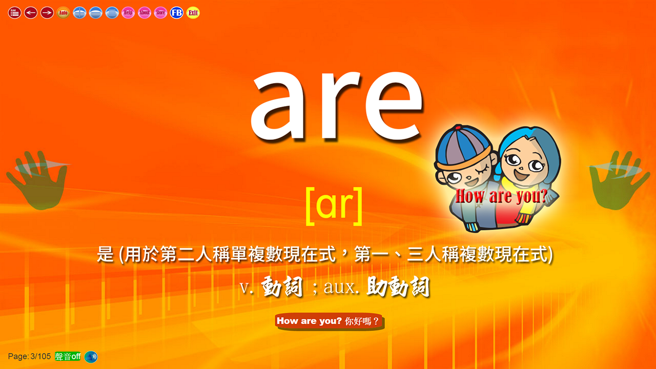 這個APP電子書是依據教育部所發佈的國中小學必學英語單字1200字編成,首推第一級包含1百多個單字A到Z.搭配音標,單字詞性和例句,真人發音可中英文隨意切換,每個單字都有精美示意圖檔讓你左右腦並用加強單字記憶.不僅可聽可讀還有螢幕書寫功能讓同學們邊聽邊動手寫.可依照單字字帖學習書寫單字,也可切換為空白底稿無聲默寫.或中英文語音切換依聽力默寫自我測驗,自動有聲播放可以讓你跟著老師發音一個個單字開口說.