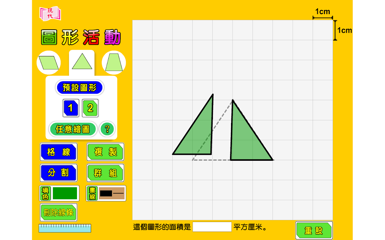 學生可於方格內建構不同平面圖形,配合多種功能如複製、分割、群組等,讓學生探究出不同圖形的面積的計算方法。