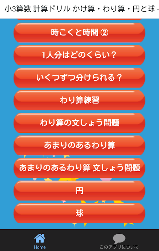 小学三年生算数 小学生向けの無料勉強アプリです。かけ算・わり算・時刻と時間・円・球・あまりのあるわり算など、小3の1学期に学習する範囲の計算ドリルです。