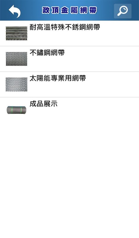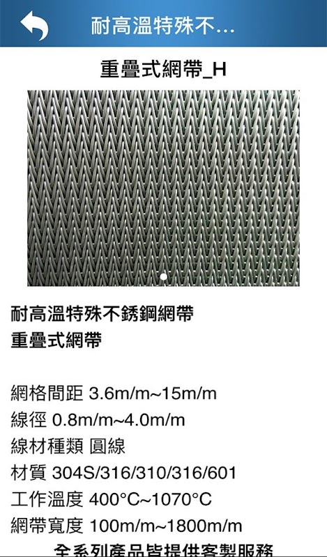 (一)耐高溫特殊不銹鋼網帶 : 力骨式網帶、重疊式網帶、細目重疊式網帶、直心力骨式網帶。(二)不鏽鋼網帶 : 力骨式網帶、重疊式網帶、金屬線輸送網帶以及各種用途之金屬網帶之客製化製造。