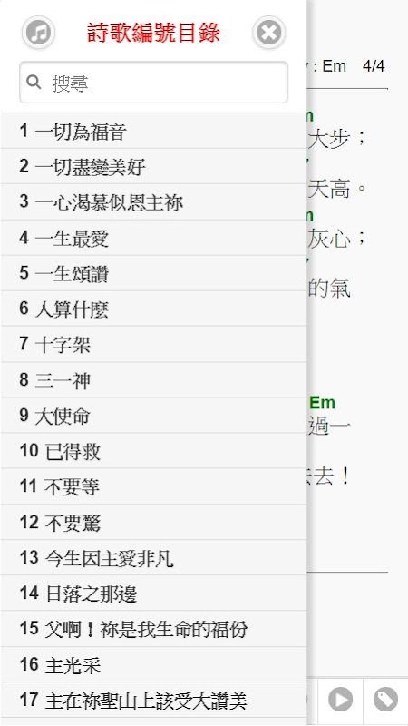 提供書籤目錄內詩歌播放模式:啟動時《工具條》會自動隱藏,螢幕會顯示《書籤列表》內的第一首詩歌。滑動螢幕的左或右時,會顯示《書籤列表》內的上一首或下一首詩歌,長按螢幕會重新顯示《工具條》。
