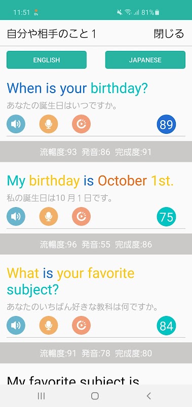 ●「かいわ」では「流暢度」「発音」「完成度」の3つの点数も出ます。