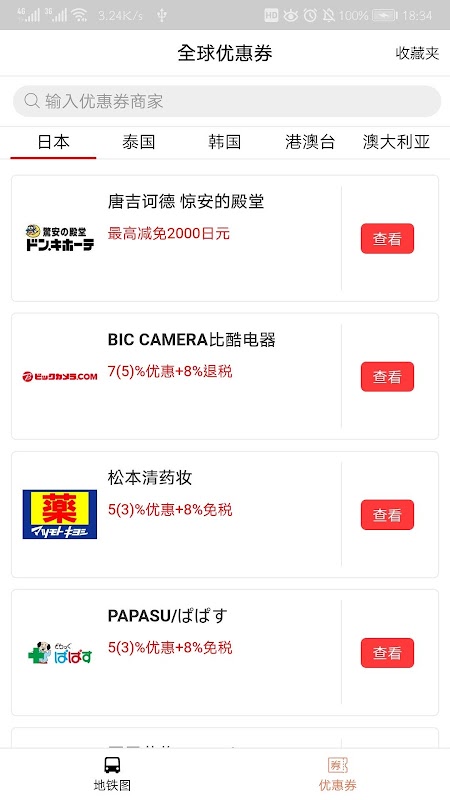 - 日本10大区域:关东 中部 北陆 近畿 中国 四国 九州 北海道 东北 冲绳岛- 查询所有地铁线路、站点、时刻表- 日本药妆店、百货商场、免税店的优惠券