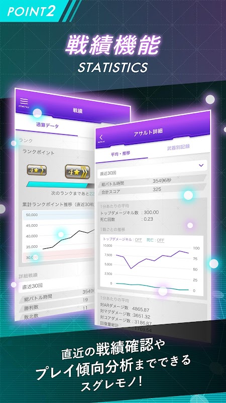 機体のカスタマイズはもちろん、ご自身の詳細な戦績や、直近の戦績がどう変化したかも細かくチェック可能。