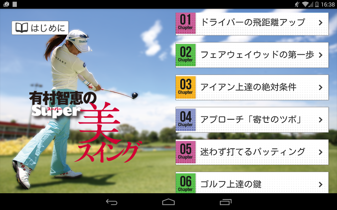 女子プロゴルファーの中でも"美しい"と定評のある有村智恵のスイングを見ながら、アマチュアが上達するための秘訣を解説。ドライバーからパターまで、ビデオブックアプリで"美スイング"を手に入れよう!