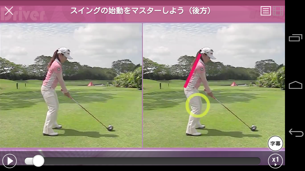 スイングの再生には、スワイプ操作でスムーズにコマ送り再生・逆再生ができるビデオビューワを使用していますので、スイング中の細かい動きをじっくりと確認いただけます。