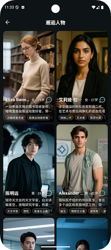 แชทตัวละคร AI: พบกับตัวละครเสมือนจริงที่มีเอกลักษณ์เฉพาะ ตั้งแต่ปราชญ์ผู้ชาญฉลาดไปจนถึงนักเดินทางลึกลับ ซึ่งแต่ละตัวจะมีเรื่องราวที่ไม่เหมือนกัน เจาะลึกเข้าไปในบทสนทนา ค่อยๆ ปลดล็อกเรื่องราวของพวกเขา และแม้กระทั่งกลายเป็น "ตัวละครสำคัญ" ในเนื้อเรื่องของพวกเขา