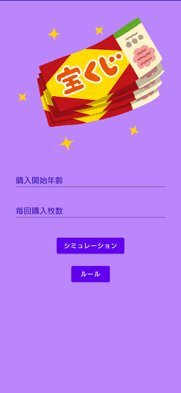宝くじを購入開始する年齢、毎回何枚買うかを入力してスタート。