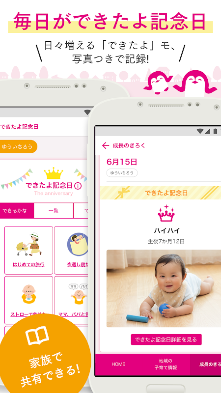 คุณสามารถเก็บบันทึกการเจริญเติบโตของบุตรหลานของคุณ รวมถึงบันทึกต่างๆ เช่น ``การรับสมุดบันทึกของแม่และเด็ก'' ในระหว่างตั้งครรภ์ และ ``เดินไปตามทาง'' หลังคลอด พร้อมรูปถ่ายความสำเร็จของบุตรหลานของคุณ