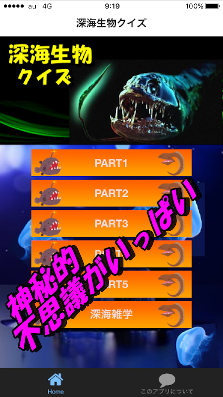 深海生物のクイズアプリが登場。奇妙で不思議でロマンあふれる生物でいっぱい。解説付きで、動画も見ることが出来ます。まるで海底探検しているように楽しめます。