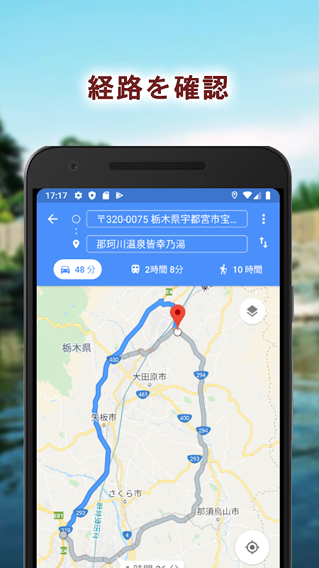 เป็นแอพพลิเคชั่นที่ค้นหาแหล่งน้ำพุร้อนแบบไปเช้าเย็นกลับทั่วประเทศญี่ปุ่น คุณสามารถค้นหาข้อมูลบ่อน้ำพุร้อนจากพื้นที่จังหวัดหรือแผนที่ และตรวจสอบภาพถ่าย ที่อยู่ หมายเลขโทรศัพท์ คำพูดปากต่อปาก และอื่นๆ ของบ่อน้ำพุร้อนได้จากหน้ารายละเอียดบ่อน้ำพุร้อน