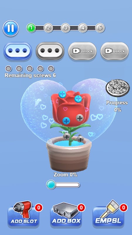 ความยากในการไขสกรูก็เพิ่มขึ้นอย่างรวดเร็ว สร้างความแปลกใหม่และความตื่นเต้นให้กับผู้เล่นอย่างต่อเนื่อง นอกจากนี้ เกมยังมีระบบประกอบฉากที่ครบครัน ช่วยให้ผู้เล่นไขปริศนาที่ท้าทายได้อย่างง่ายดายด้วยอุปกรณ์วิเศษต่างๆ