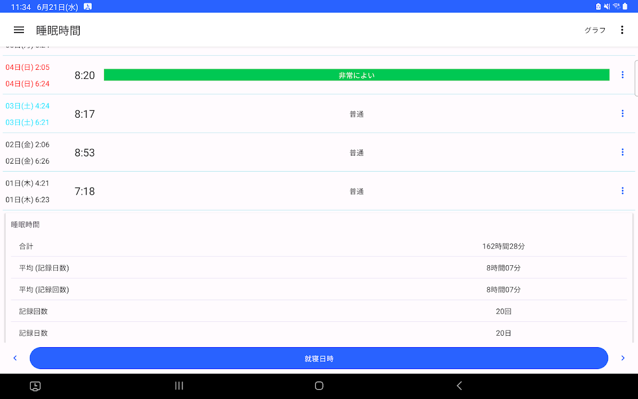 บันทึกเวลานอนและแสดงกราฟ แอพที่บันทึกวันที่และเวลาที่คุณเข้านอนและวันที่และเวลาที่คุณตื่นนอนและคำนวณเวลานอนของคุณ