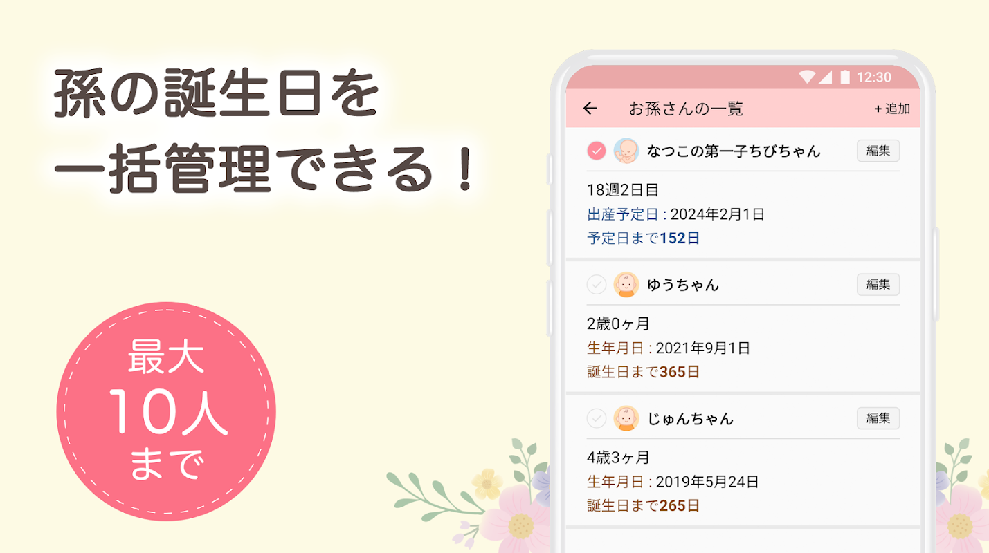 คุณสามารถลงทะเบียนหลานได้หลายคน เพื่อให้คุณเห็นว่าแต่ละคนเติบโตอย่างไร! นอกจากนี้ คุณยังสามารถจัดการวันเกิดและชื่อหลานของคุณได้ในคราวเดียว และคุณจะได้รับการแจ้งเตือนเมื่อวันเกิดใกล้เข้ามา ดังนั้นคุณจึงไม่ต้องกังวลกับการลืมวันเกิดของหลาน!