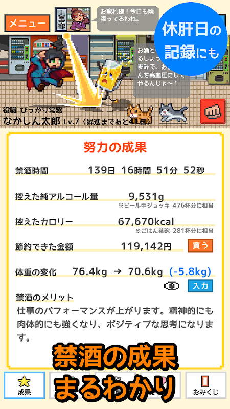 คุณสามารถดูผลลัพธ์ได้อย่างรวดเร็ว ○เมื่อคุณป้อนข้อมูลการดื่ม ระบบจะคำนวณระยะเวลาที่คุณหยุดดื่ม แคลอรี่ที่คุณหลีกเลี่ยง จำนวนเงินออมที่คุณประหยัดได้โดยอัตโนมัติ การแสดงผลลัพธ์จะช่วยเพิ่มแรงจูงใจและส่งเสริมความต่อเนื่อง หากคุณใช้มันเพื่อควบคุมอาหาร ลดน้ำหนัก หรือฝึกกล้ามเนื้อ คุณสามารถบันทึกน้ำหนักของคุณได้