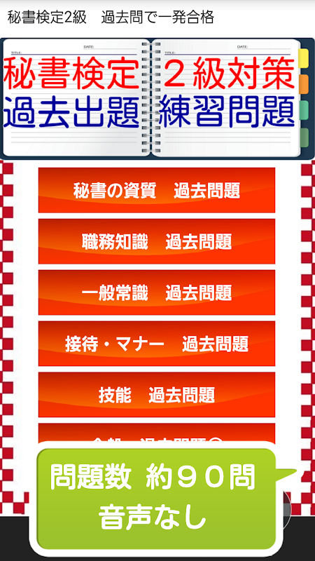 このアプリは秘書検定2級の合格にむけて過去問題をあつめた無料学習アプリです。秘書検定2級は大学生の受験者割合が最も多く、3級よりも深い知識を要求されます。