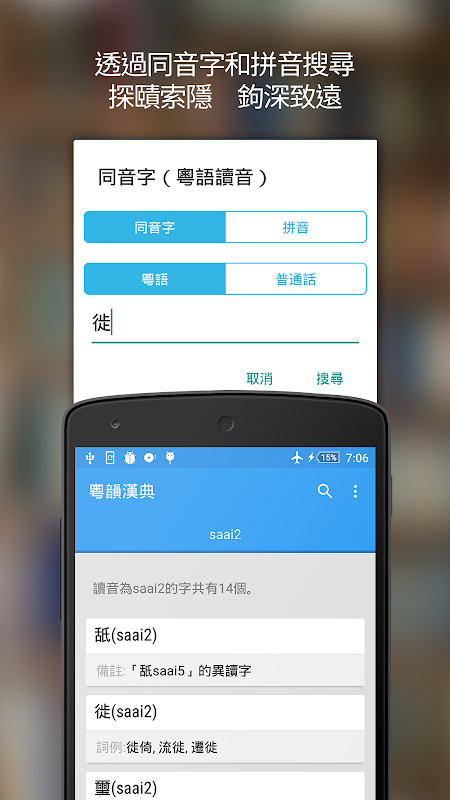 粵韻漢典v2是一部離線中文字典,內置字庫和發音檔,讓你離線同時查閱粵語審音配詞字庫及漢典。當你按下字義,便可聆聽粵語和普通話讀音。