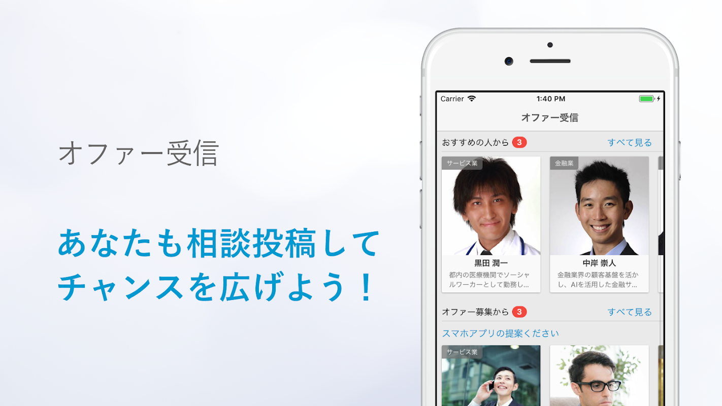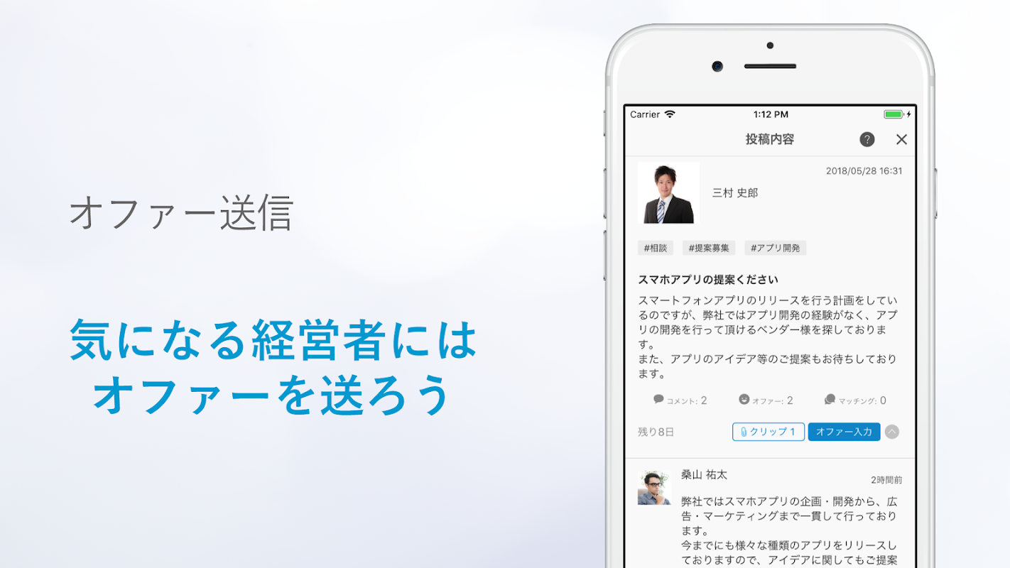 オファー募集機能は、相談を投稿することで、他の経営者からコメントや提案が届きます。あなたはマッチングを選ぶだけ。